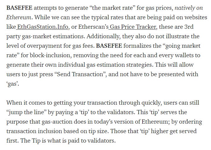 There has been a lot of technical documentation written about this EIP already which you can read here and here (also David Hoffman’s piece is a long-ish read but really good). If you’re not familiar with all of the mechanisms of EIP-1559, I suggest reading those pieces as today I’m only going to summarise the impact that this EIP would have for the network as a whole and ultimately for the value accrual properties of ETH.