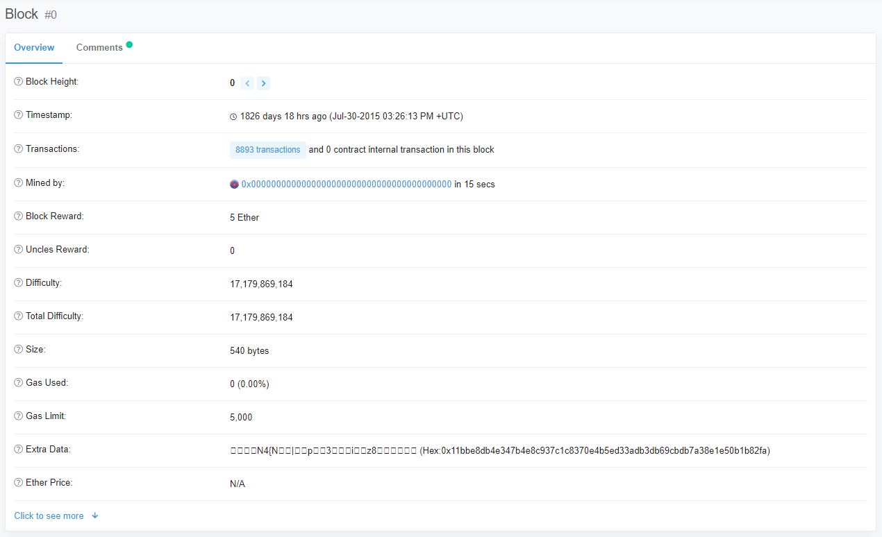 The Ethereum Genesis block (source: https://etherscan.io/block/0)