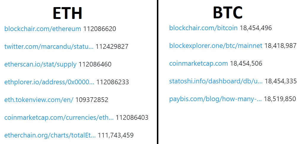 Different block explorers/data providers also fail to report the correct BTC and ETH supply because they have their own ways of calculating it. Some take the naive approach for BTC of just doing the simple math (block reward calculation) which misses all of the things I mentioned above. With ETH, block explorers/data providers may write their own scripts to calculate this value, do naive math based on block rewards or just simply copy other providers. You can see below how large some of the discrepancies can be between providers.