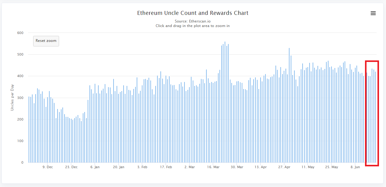 So, what are the consequences of raising the block gas limit? Well from my understanding the three things that people are worried about the most are an increase in uncle rate (because increasing the block size increases the time it takes for blocks to propagate through the network), increased denial of service (DoS) attack risk, and increased size of the Ethereum blockchain (increasing the limit to 12.5 million adds ~5gb extra a day to an archive node). At time of writing, the uncle rate has not seen an increase from the gas limit being raised - the red section of the chart below shows the uncle block count per day since the gas limit was raised (the reason it hasn’t increased can be attributed to client optimizations made over the last few months).